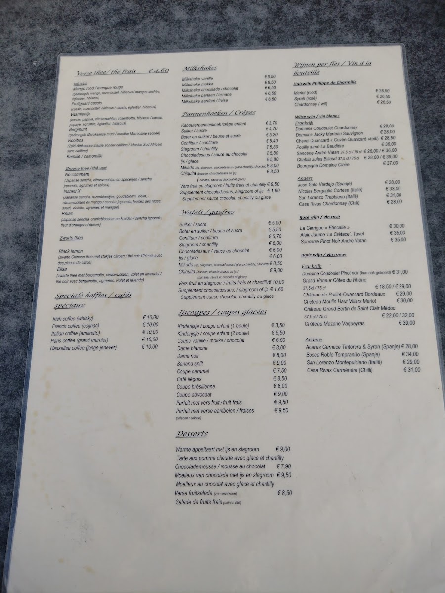 Drinks range from carefully brewed coffee, ideal for a relaxed morning or afternoon pause, to local beers like Brugse Zot and Bière la Chouffe, which pair naturally with many of the menu’s rich, savory offerings. Whether stopping by for a casual meal with family or winding down with friends over a cold beer, the menu supports moments of simple enjoyment without hurry.